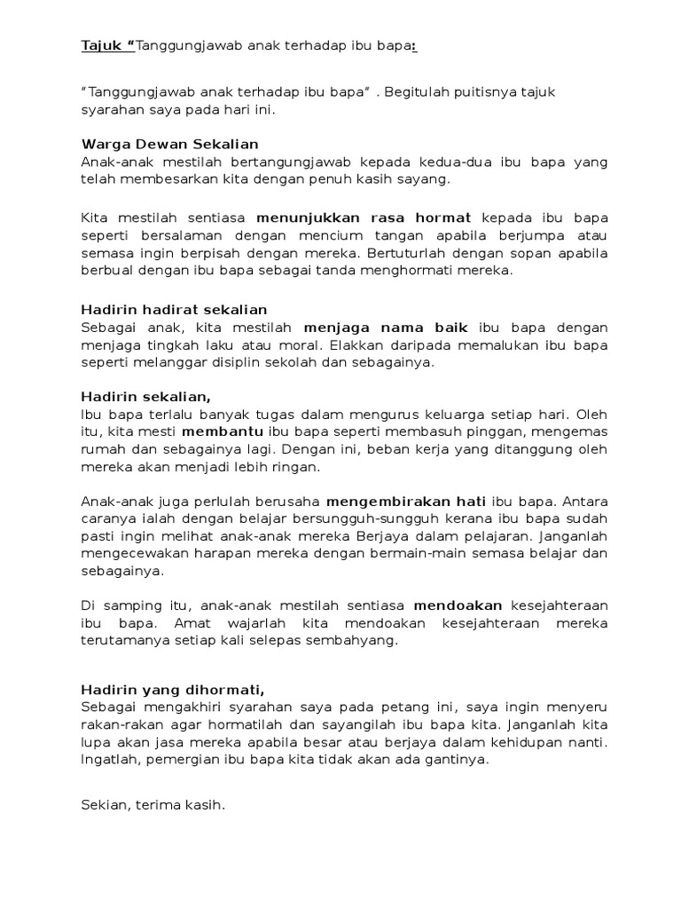 Teks syarahan tahun 4 5 6. Seperti yang kita ketahui ibu bapa adalah insan yang paling banyak jasa yang mereka korbankan untuk kita sepanjang hayat kita. Peranan Anak Terhadap Ibu Bapa Pdf.
